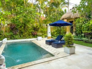 This perfect example of villas in Seminyak with private pool is situated down a quiet gang off Jalan. Kayu Aya (Laksmana, or ‘Eat Street’), called Gang Bugis. A short walk will bring you into the centre of Seminyak, a fashionable area with an abundance of boutique shopping options, as well as numerous restaurants, spas, art galleries boutique shops and nightclubs. The beach is only a 15 minute walk from the villa, which is the perfect place to enjoy a stunning sunset. The villa is an oasis nestled in a quiet lane but conveniently only a stroll to everything you’ll need to make your holiday perfect.